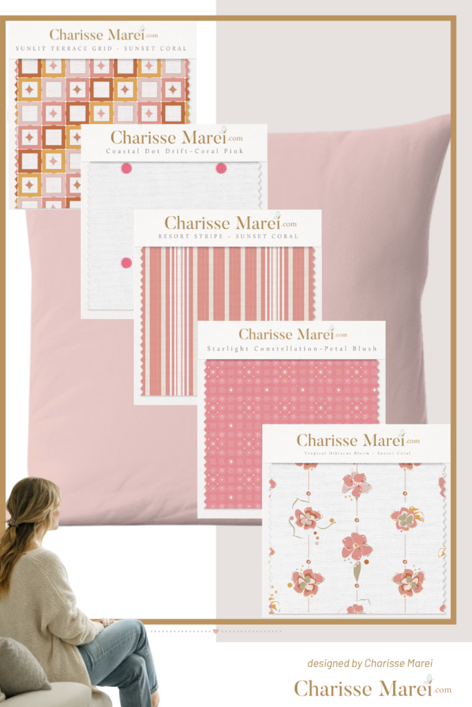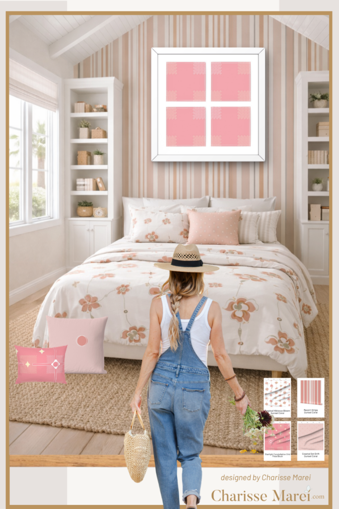 Soft light filtering through the windows. A palette drawn from nature—sea-washed blues, warm coral, delicate petal blush. Patterns that move like a breeze . . . never loud, always flowing.