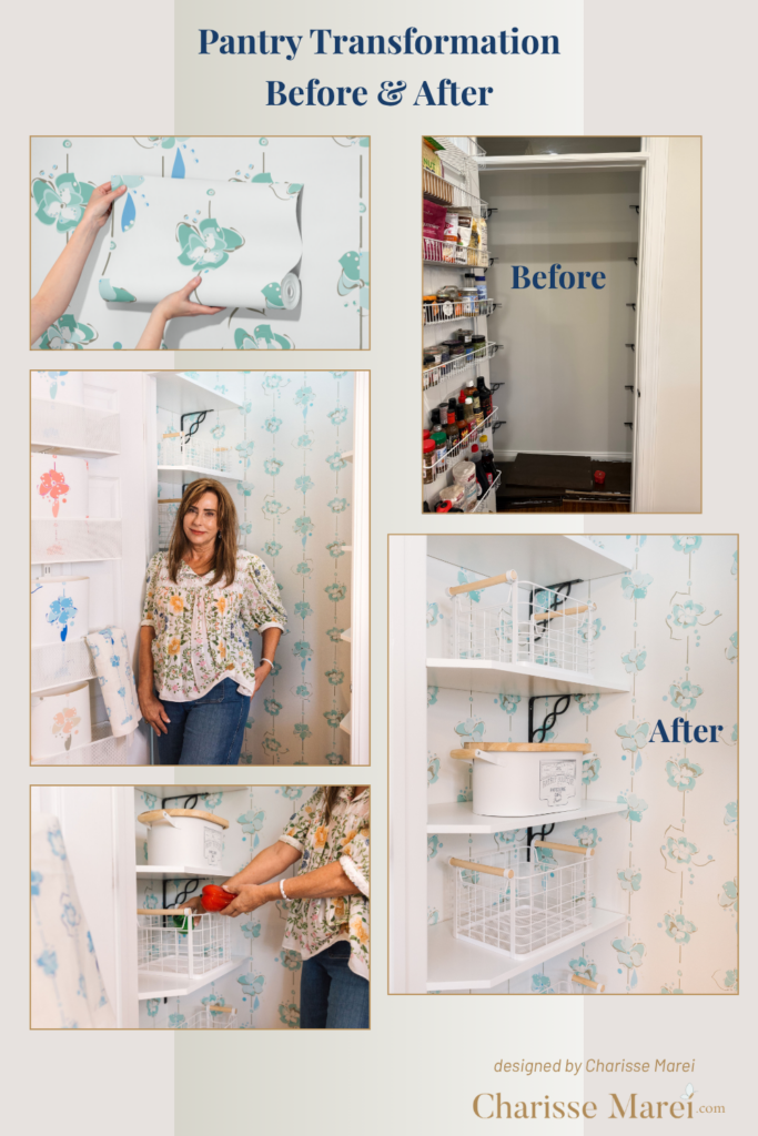 In this pantry transformation, soft coastal florals create the anchor, structured shelving brings rhythm, and a light, airy palette sets the tone—transforming a purely functional space into one that feels both organized and uplifting.